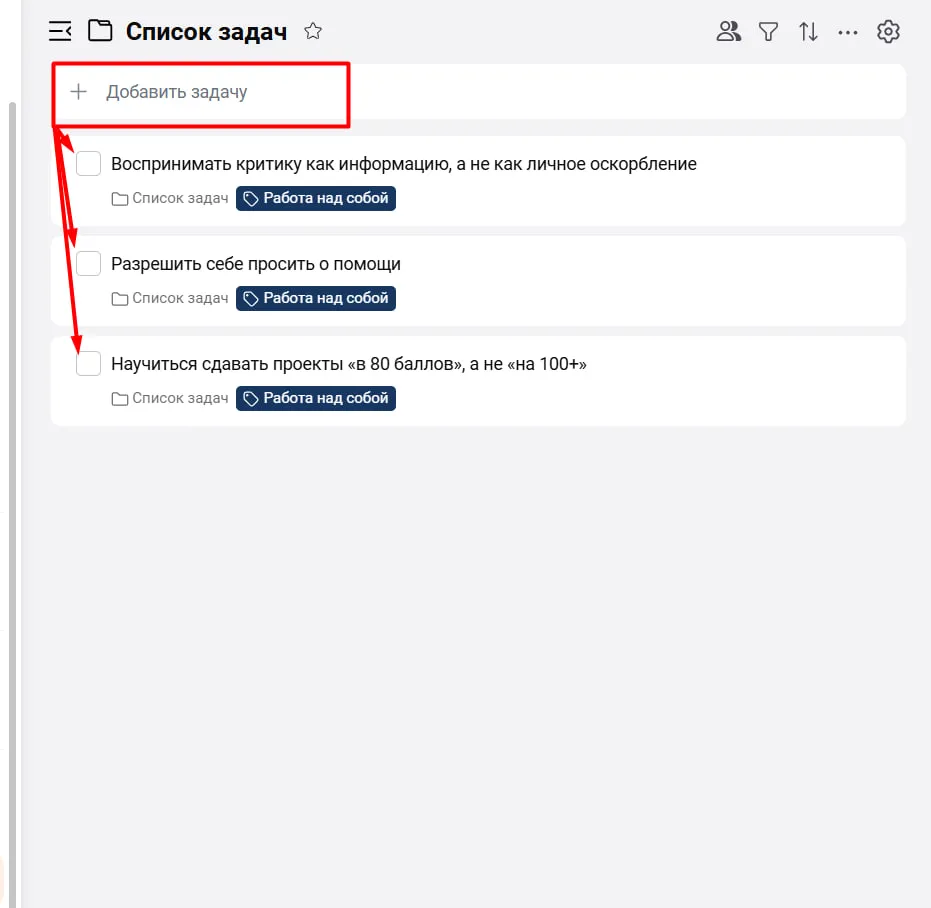 Функция таск-менеджера: категории / метки. Создайте отдельную категорию «Зона работы над собой» — это сразу упорядочит мысли и снизит ощущение хаоса.