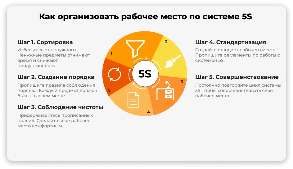 Это метод, который повышает эффективность бизнеса или отдельных сотрудников через организацию рабочего пространства. Он помогает качественно выполнять работу, затрачивая на нее минимум сил и времени.