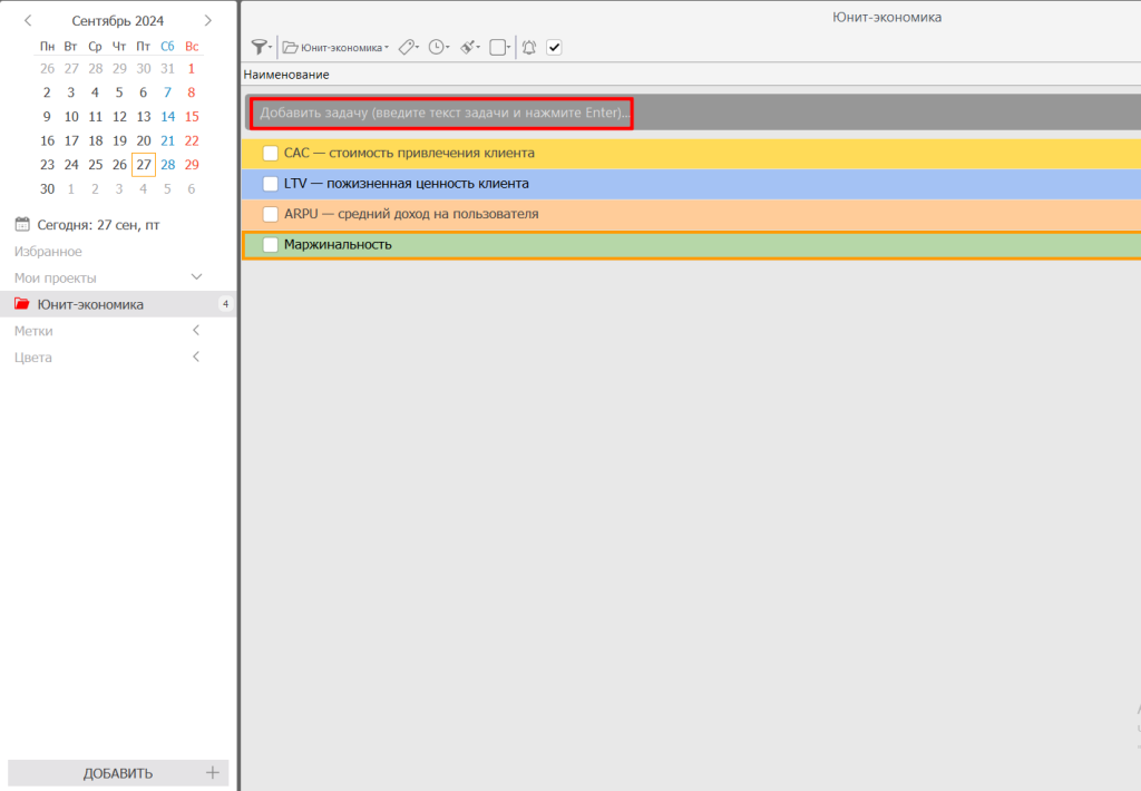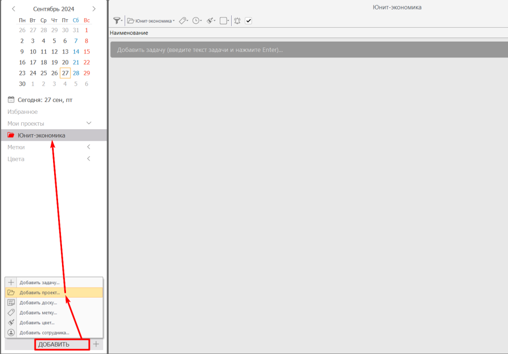 - Нажмите на кнопку «Добавить проект» и дайте ему название, например, «Юнит-экономика».