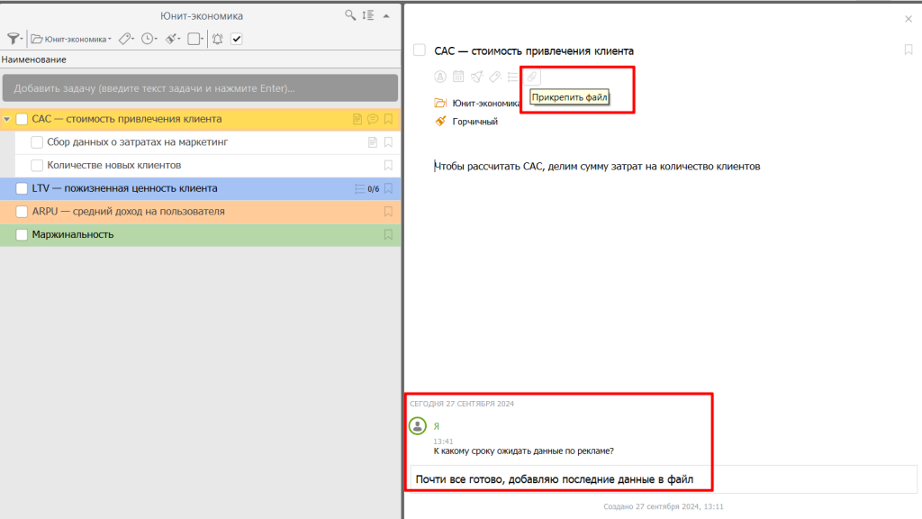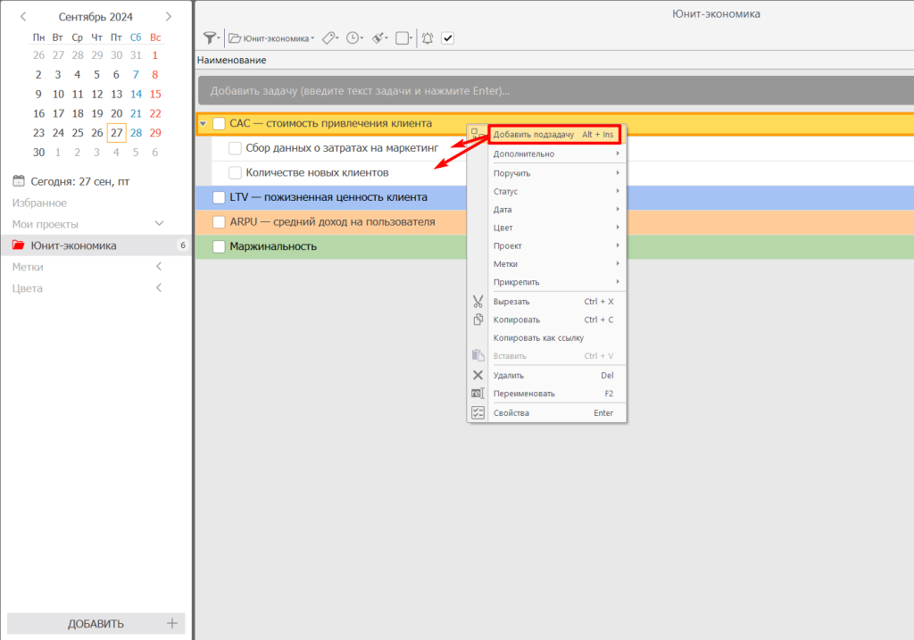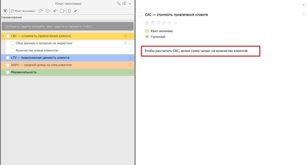 - Добавьте подпункты. Например, «CAC — стоимость привлечения клиента» может включать в себя подзадачи по сбору данных о тратах на рекламу и количестве новых пользователей.