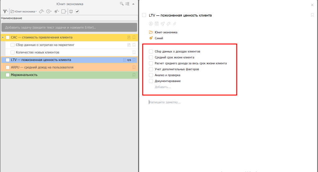 - В каждой задаче добавьте чек-лист с шагами, которые необходимо выполнить для расчета метрики. Например, для расчета LTV можно создать чек-лист из следующих пунктов: сбор данных о доходах клиентов, средний срок жизни клиента, расчет среднего дохода за весь срок жизни клиента, учет дополнительных факторов, анализ и проверка, документирование.