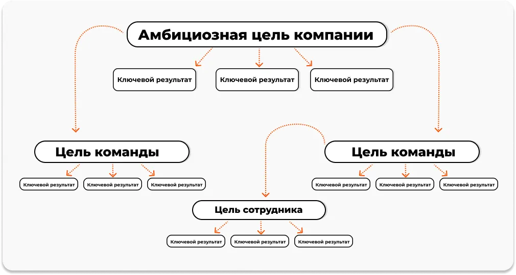Цели сотрудника напрямую поддерживают цели компании, а ключевые результаты помогают оценить прогресс как на уровне компании в целом, так и на уровне отдельного сотрудника.