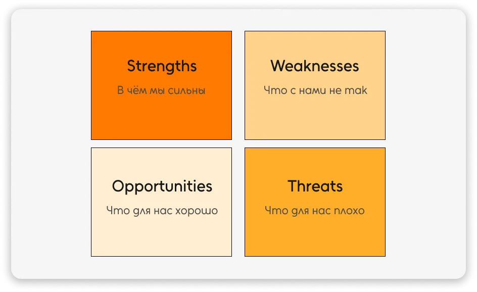 Threats (Угрозы): внешние риски, которые могут помешать вашему успеху, такие как конкуренция или изменения в экономике.