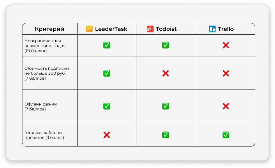Например, нужно выбрать таск-менеджер. Есть несколько вариантов, и вы не знаете, какой выбрать. Составьте список критериев и назначьте им баллы по степени важности, где 10 — очень важный, а 1 — совсем не важный. Например, на 7 из 10 баллов вам важно, чтобы подписка стоила не больше 300 руб. в месяц. На 10 из 10 важно, чтобы у задач была неограниченная вложенность.