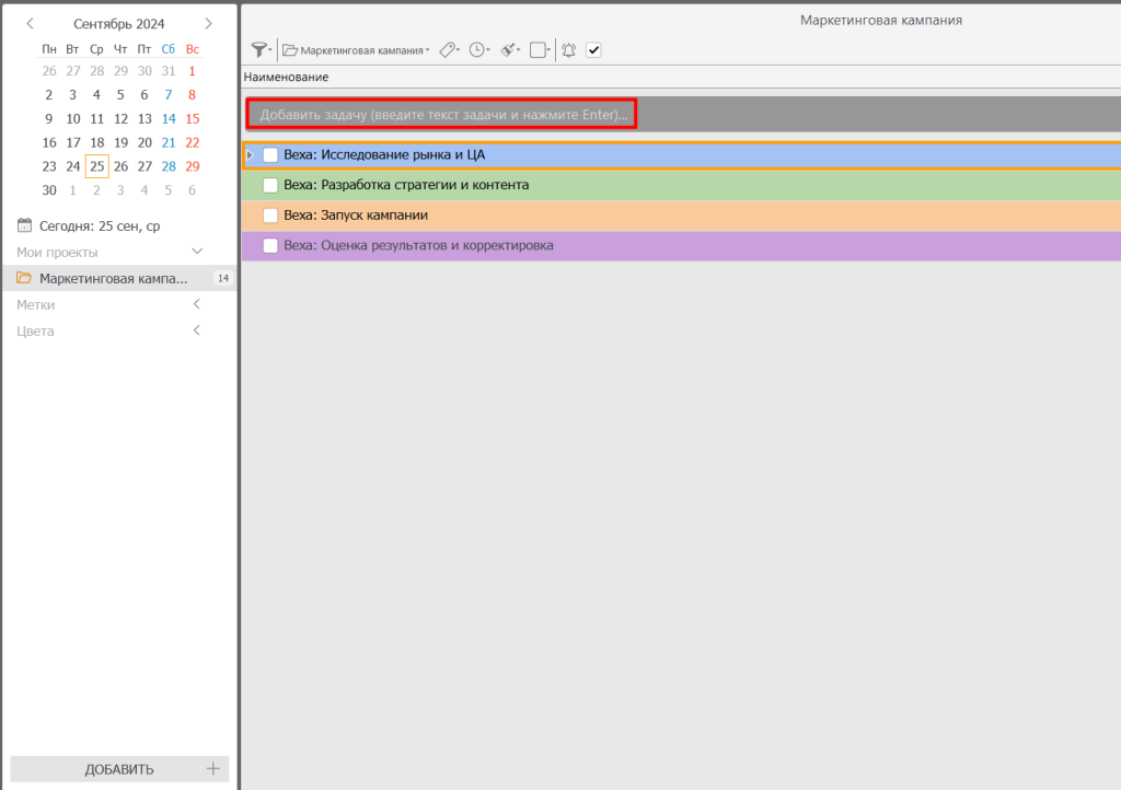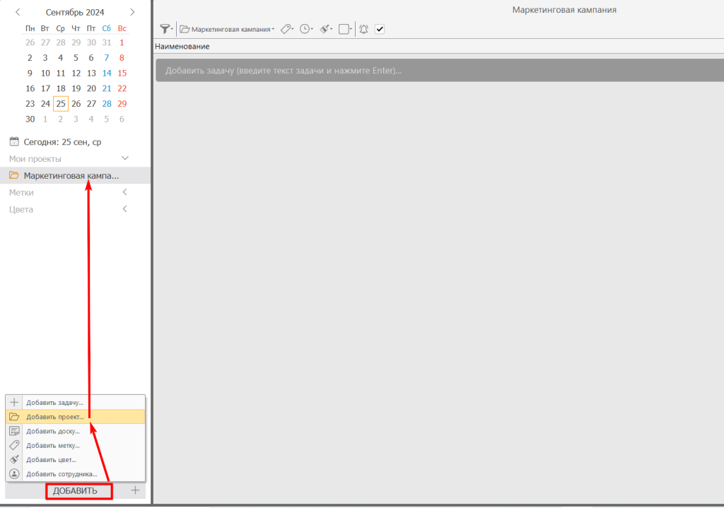 - Нажмите «Добавить проект» и введите название проекта. В нашем случае это будет «Маркетинговая кампания».