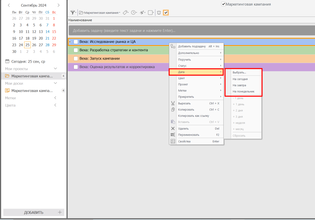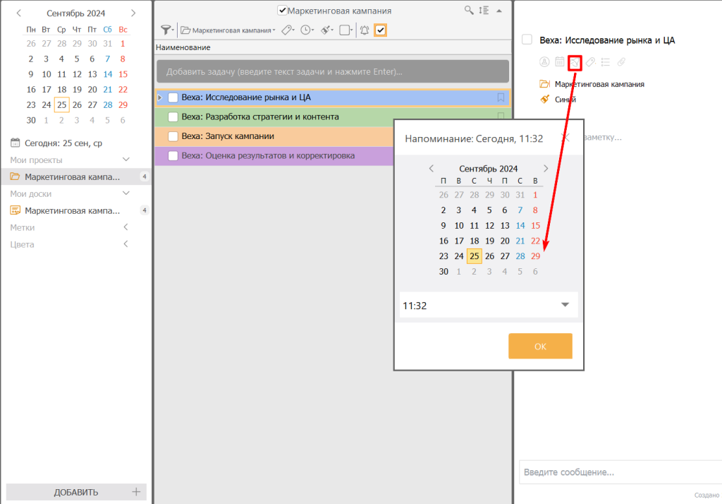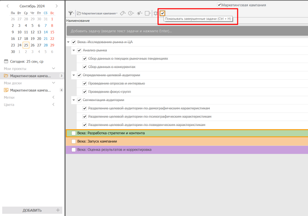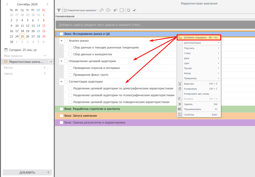 - Для каждой вехи создайте отдельную задачу. В названии задачи четко укажите, что это контрольная точка (например, «Веха: Исследование рынка и ЦА»).