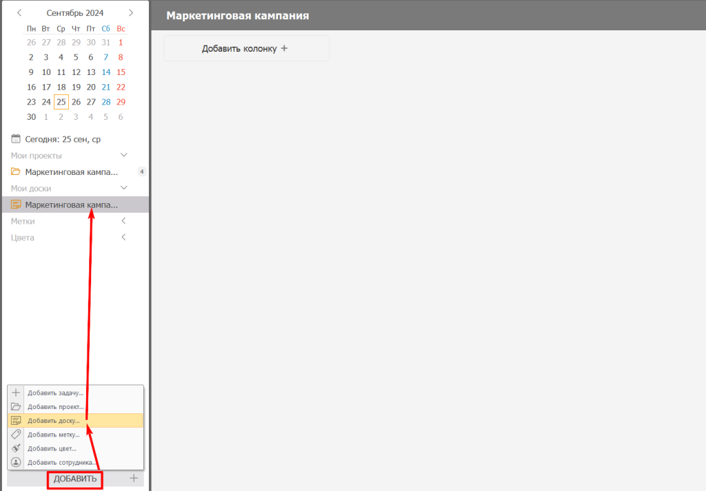- Добавьте доску, дайте название.