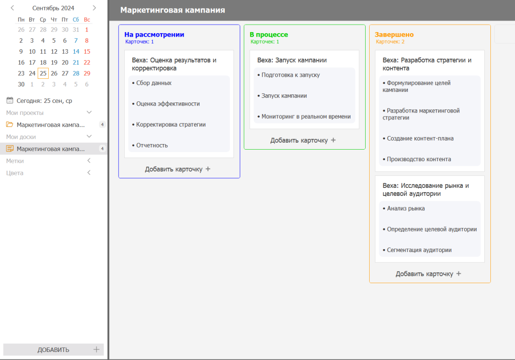 - Создайте колонки, соответствующие этапам проекта (например, «На рассмотрении», «В процессе», «Завершено»). Перетащите задачи-вехи в соответствующие колонки.